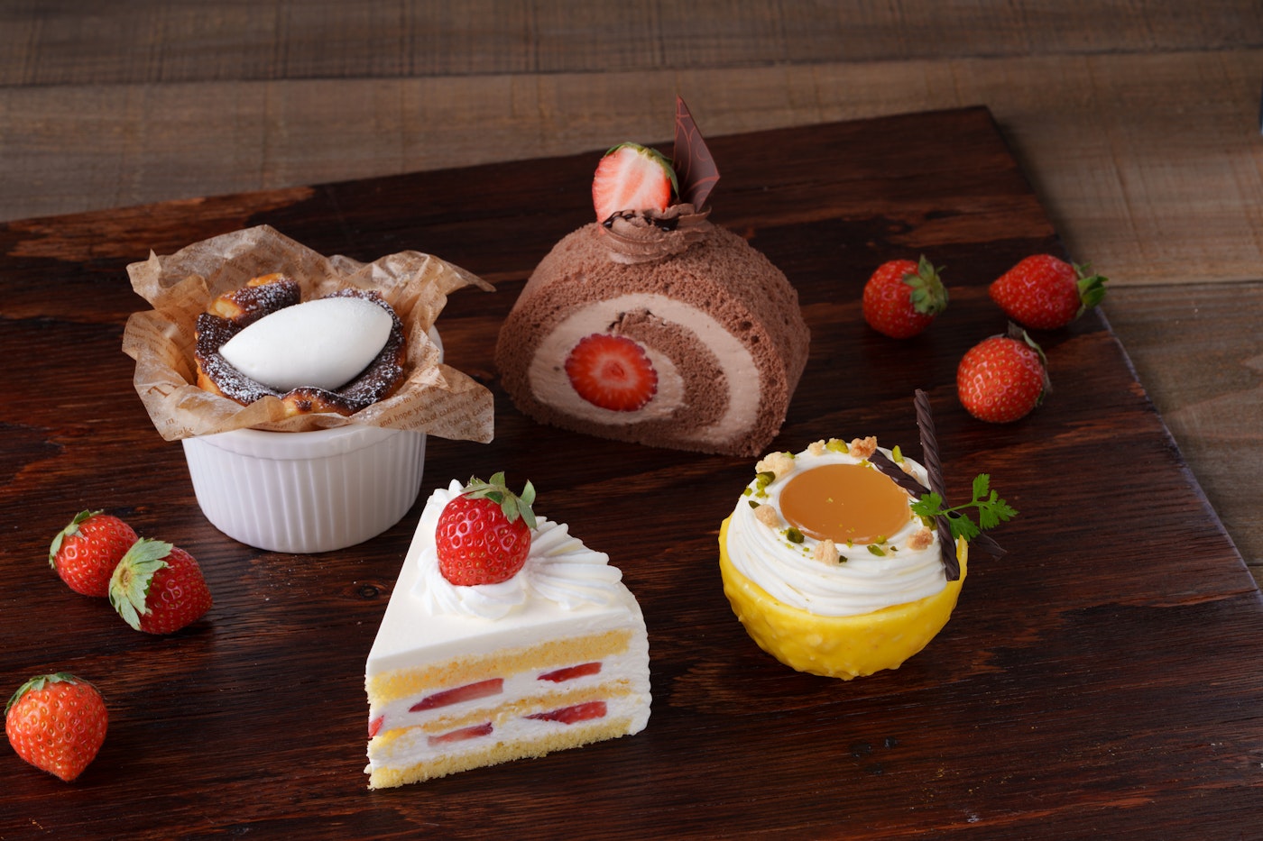 またフォンテーヌでは、さまざまな苺の味わいをお楽しみいただける苺づくしのアフタヌーンティーセットや苺とチョコレートのロールケーキをご用意しております。