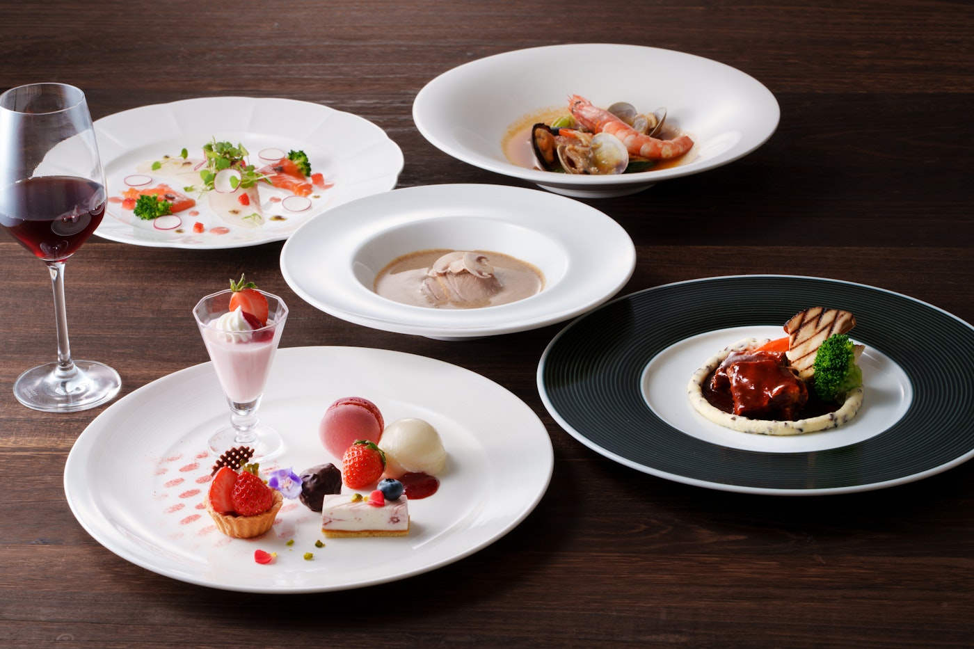 コースのはじめを彩る宮城県産『銀鮭』と真鯛のカルパッチョの前菜は、苺とフランボワーズビネガーのドレッシングでさっぱりとお召しあがりいただけます。風味豊かな山形県 舟形町産マッシュルームのポタージュや、魚介のうまみが凝縮したブイヤベースソースとともに味わう白身魚と有頭エビのポワレはこの時期におすすめです。食事の結びを飾るデザートは、苺マカロンや苺とチョコレートのパイタルト、苺とレアチーズのムースなど苺スイーツ盛合せをお楽しみいただけます。