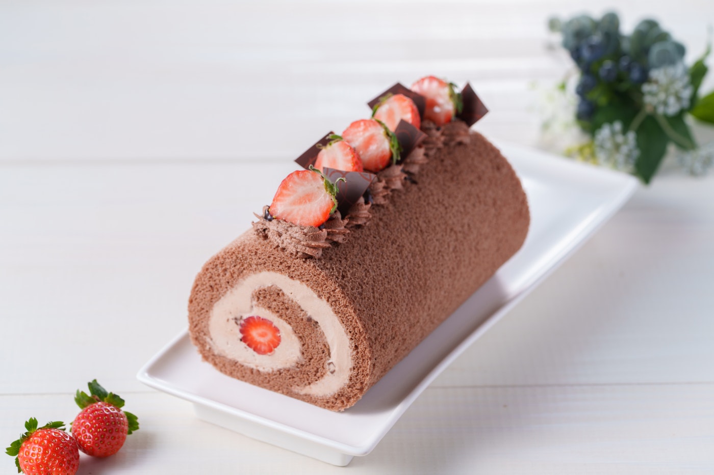 苺とチョコレートのロールケーキはふわふわシフォン生地に、まるごと苺とチョコレートクリームを包んだ苺とチョコレートの相性抜群なロールケーキです。